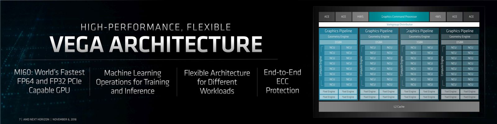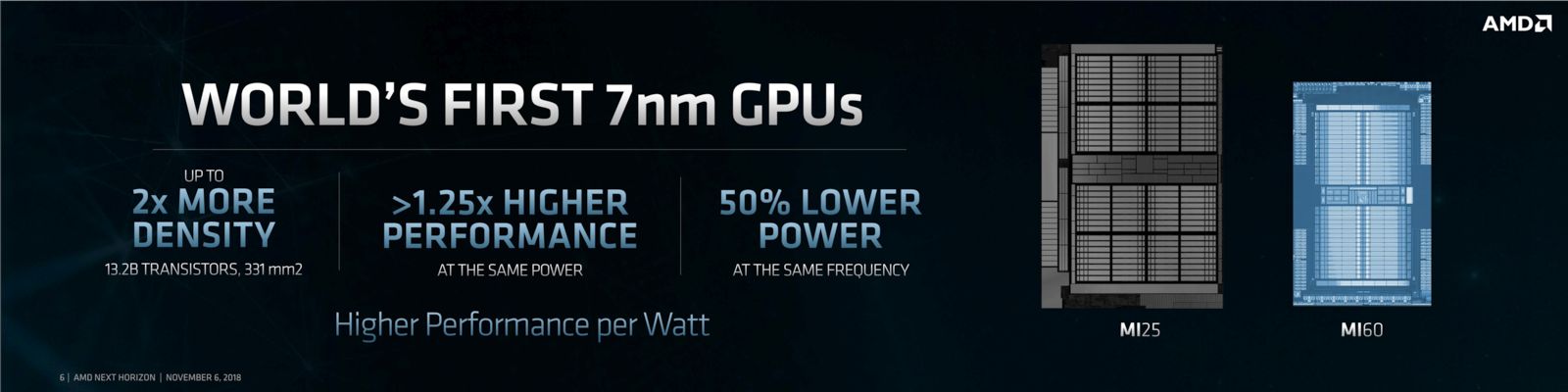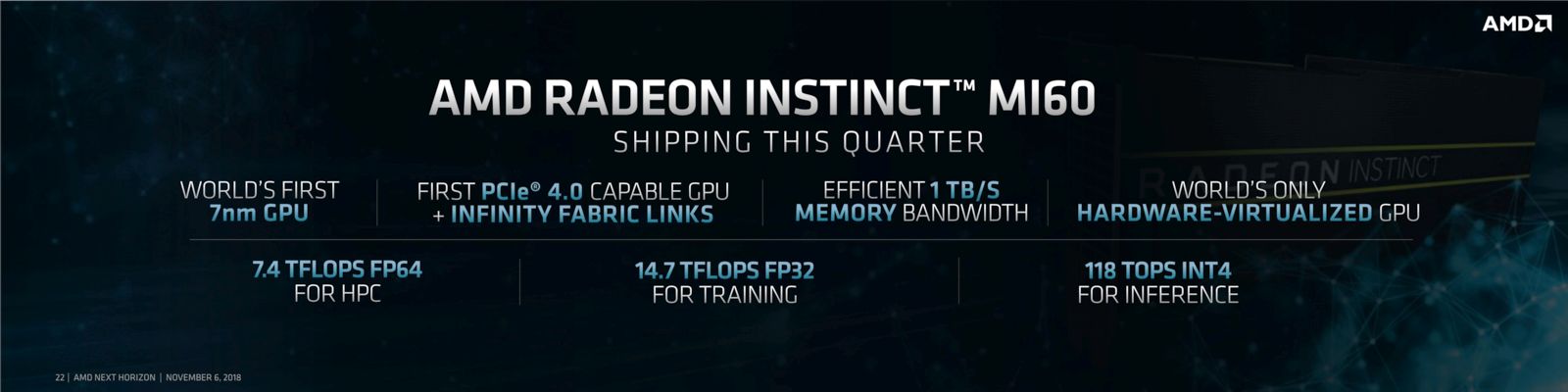 ή ανακοίνωση των νέων επιταχυντών, Instinct MI60 και MI50 στην εκδήλωση "Next Horizon" της AMD. Οι νέες κάρτες Instinct, προορίζονται για χρήση από μεγάλες επιχειρήσεις, οι οποίες τρέχουν έργα που απαιτούν ιδιαίτερα υψηλή υπολογιστική ισχύ, συμπεριλαμβανομένων και αυτών που σχετίζονται με τεχνητή νοημοσύνη και μηχανική μάθηση