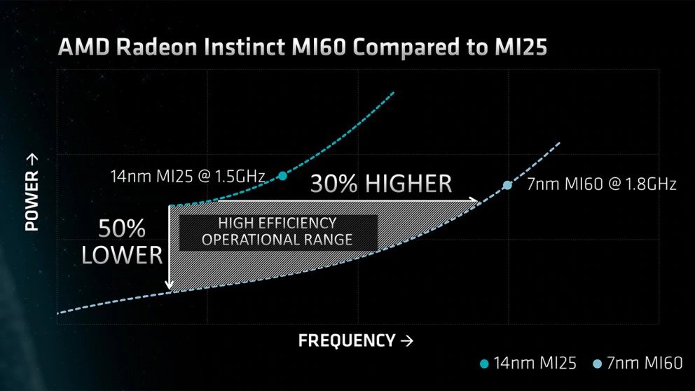Οι νέες Instinct χρησιμοποιούν GPUs οι οποίες βασίζονται σε μια τροποποιημένη έκδοση της αρχιτεκτονικής Vega, την Vega 20, με σημαντικές βελτιώσεις οι οποίες προορίζονται και είναι απαραίτητες σήμερα στην αγορά των επιταχυντών. Η μέθοδος κατασκευής των 7nm στα εργοστάσια της TSMC, επιτρέπει επίσης στην AMD να ανεβάσει συχνότητα λειτουργίας, χωρίς να δημιουργείται σημαντικό θέμα με την κατανάλωση των καρτών. Η συχνότητα λειτουργίας φτάνει στα 1,8GHz στην περίπτωση της MI60, στα 1746MHz στην περίπτωση της MI50. Η κατανάλωση της MI60 βρίσκεται πιθανόν μεταξύ 250W και 300W, αν λάβουμε υπόψιν τους δύο 8pin PCIe connectors στο πίσω μέρος της κάρτας.