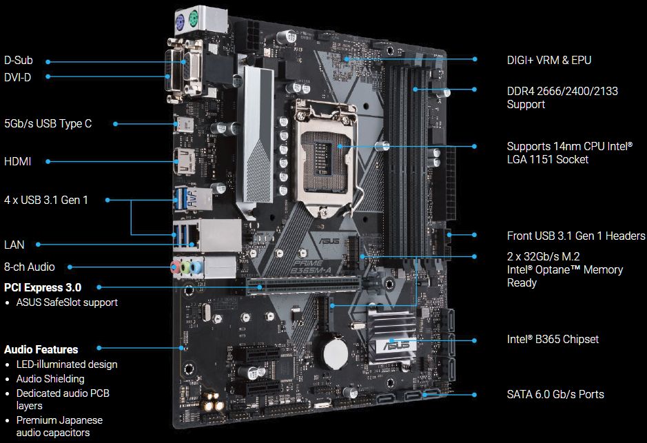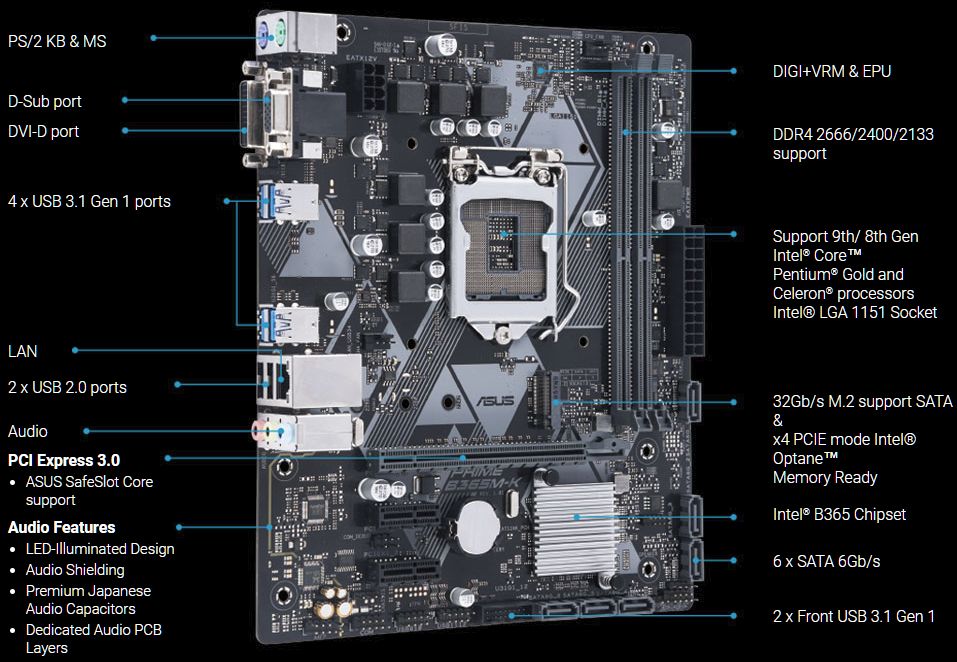 Τα δύο νέα μοντέλα φέρουν τις ονομασίες Prime B365M-A και Prime B365M-K και μπορούν να φιλοξενήσουν επεξεργαστές 8ης και 9ης γενιάς Core, Pentium και Celeron. Το Prime B365M-A είναι το ελαφρώς καλύτερα εξοπλισμένο από τα δύο. Για την τροφοδοσία του χρησιμοποιεί συνδυασμό ATX 24 pin και EPS 8 pin βυσμάτων, ενώ για την τροφοδοσία του επεξεργαστή χρησιμοποιεί κύκλωμα 4 + 2 φάσεων. Διαθέτει τέσσερις υποδοχές DDR4 DIMM, μία υποδοχή PCI-Express 3.0 x16, η οποία διαθέτει ένα μεταλλικό ενισχυτικό στήριγμα, καθώς και δύο επιπλέον υποδοχές τύπου PCIe 3.0 x1 οι οποίες συνδέονται στο PCH.